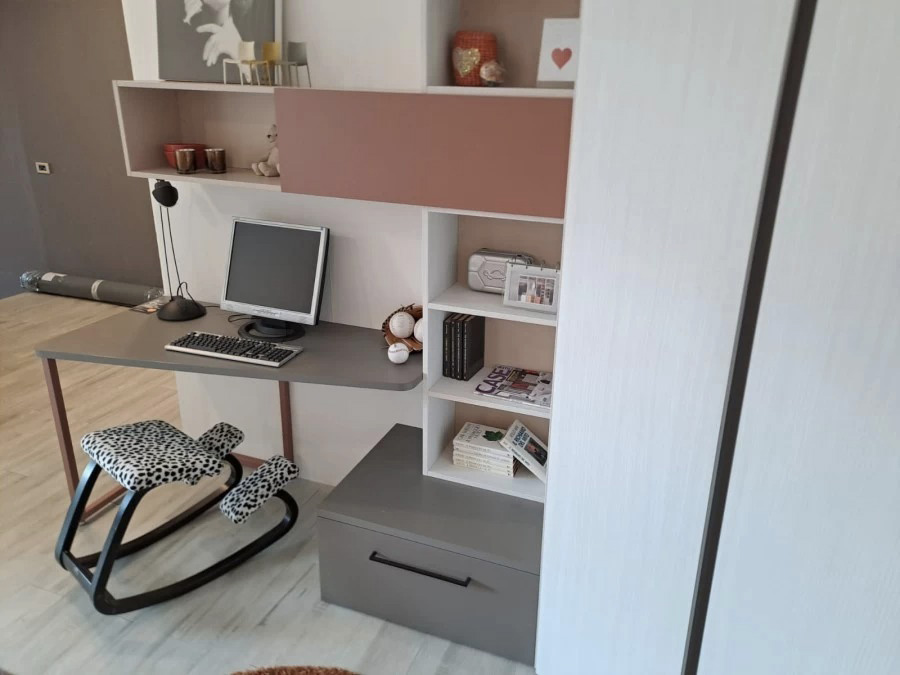 La zona studio è costituita da un piano scrivania ampio (180 x 45,8 cm) con boiserie Dotts e due casellari da 90 cm, offrendo un’area dedicata allo studio pratica e ben organizzata.