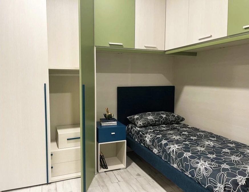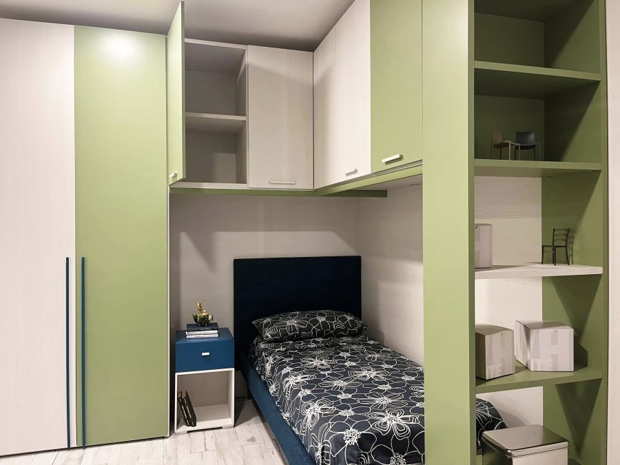 La cameretta con ponte ad angolo di Moretti Compact offre una soluzione funzionale e moderna, ideale per ottimizzare lo spazio senza rinunciare allo stile.