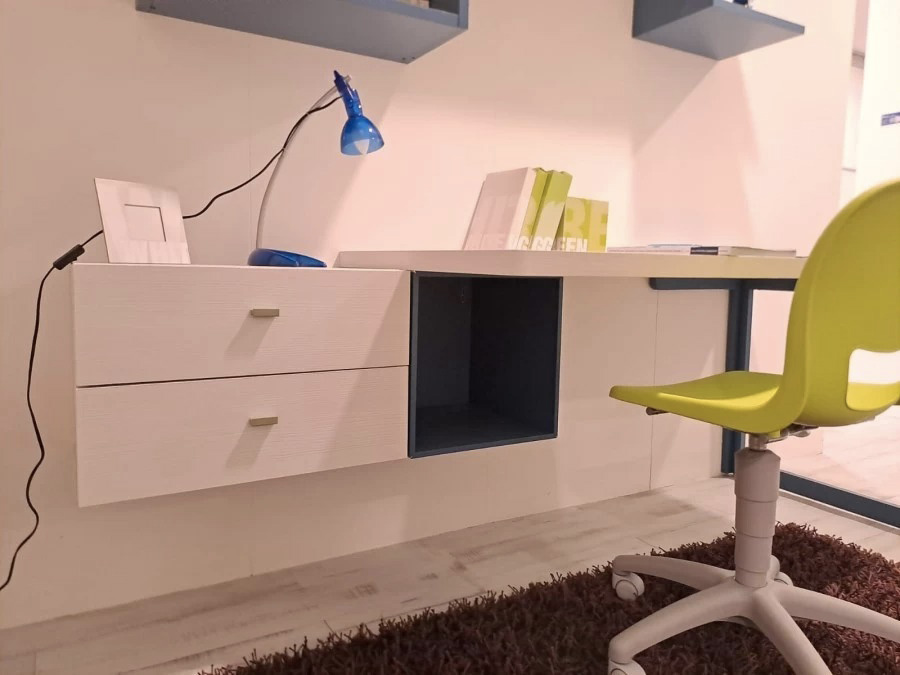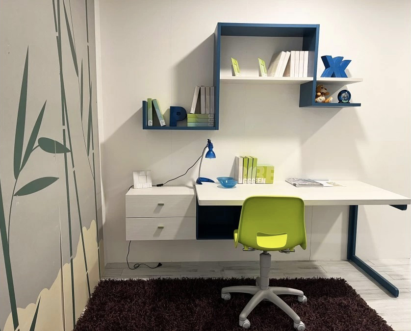 Nella zona studio, troviamo una scrivania da 153 x 76 cm con una cassettiera appesa a due cassetti e un wallbox a giorno, perfetti per un’area di studio organizzata e funzionale.