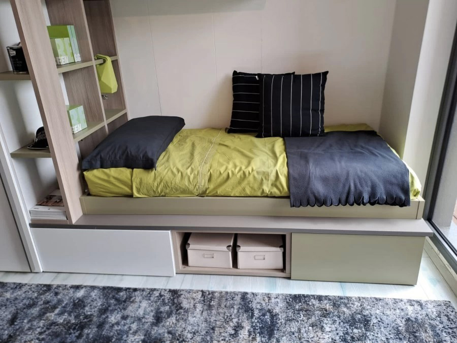 Il letto è dotato di due cassettoni e un vano a giorno, ideale per riporre oggetti e mantenere l’ordine nella stanza. A completare la composizione, dei pensili appesi offrono ulteriore spazio contenitivo senza ingombrare l’area disponibile.