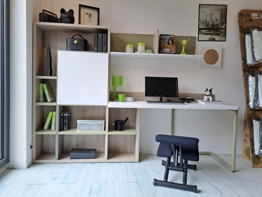 Dalla parte della scrivania, è presente una libreria combinata con elementi a giorno e chiusi, garantendo un equilibrio tra esposizione e archiviazione. La scrivania da 150 cm è sormontata da un wallbox appeso, che aggiunge funzionalità e stile all’angolo studio.
